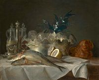 Vallayer-Coster, gewaardeerd om de kracht van haar composities, haar virtuositeit als colorist en haar magische vermogen om de natuur te imiteren, onderzoekt hoe de totale zilverkleurige tonaliteit van het schilderij varieert afhankelijk van het materiaal en de reflecties van het licht - van glas en metaal tot de beweeglijke huid van de mollige vis, verblindend weergegeven met strepen van briljant vermiljoen en oker in de buurt van de kieuwen. De reflecties worden gevoelig geobserveerd en ook het witte servet of tafelkleed neemt deel aan de nuances van het licht, allemaal gesuggereerd met de delicaatheid van de schilder. Het damastdoek bootst het type linnen na dat de kunstenaar zou hebben gehad: de initialen V en C zijn geborduurd in kleine rode kruissteek, samen met het nummer 6, voor de inventarisatie van de huishoudster van de schilde