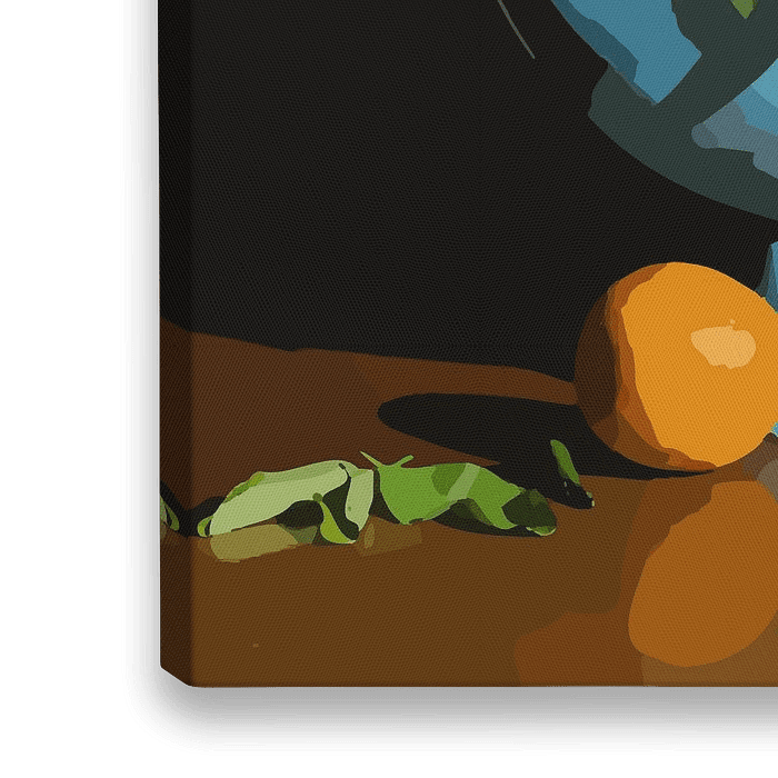 Door het contrast van de oranje en blauwe kleuren wordt het een kleurrijk modern stilleven en met tegenhanger de diepe schaduw maakt het werk erg interessant om naar te…