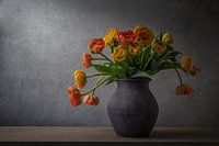Dit stilleven met pioentulpen heeft een grijs antraciete achtergrond en is in een liggend formaat (landschap formaat) uitgevoerd.