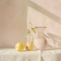 Dit schilderij is een prachtig stilleven in zachte pasteltinten, dat een serene en elegante sfeer uitstraalt. Het kunstwerk toont een zorgvuldig gearrangeerde compositie van objecten: een delicate glazen vaas met een enkele tak, een citroen, een peer en een stijlvolle keramische vaas. De zachte roze en beige tonen van de achtergrond…