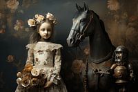 Maar het verhaal ontvouwt zich verder wanneer je oog valt op het metgezel van de pop – een majestueus paard, eveneens gecreëerd door de kunstmatige intelligentie met verbazingwekkende finesse. Het paard, een sublieme combinatie van kracht en gratie, staat naast de pop als een loyaal metgezel. De glans van zijn ogen lijkt een geheim te bewaren, alsof het de getuige is geweest van vele verhalen die door de tijd zijn geweven.