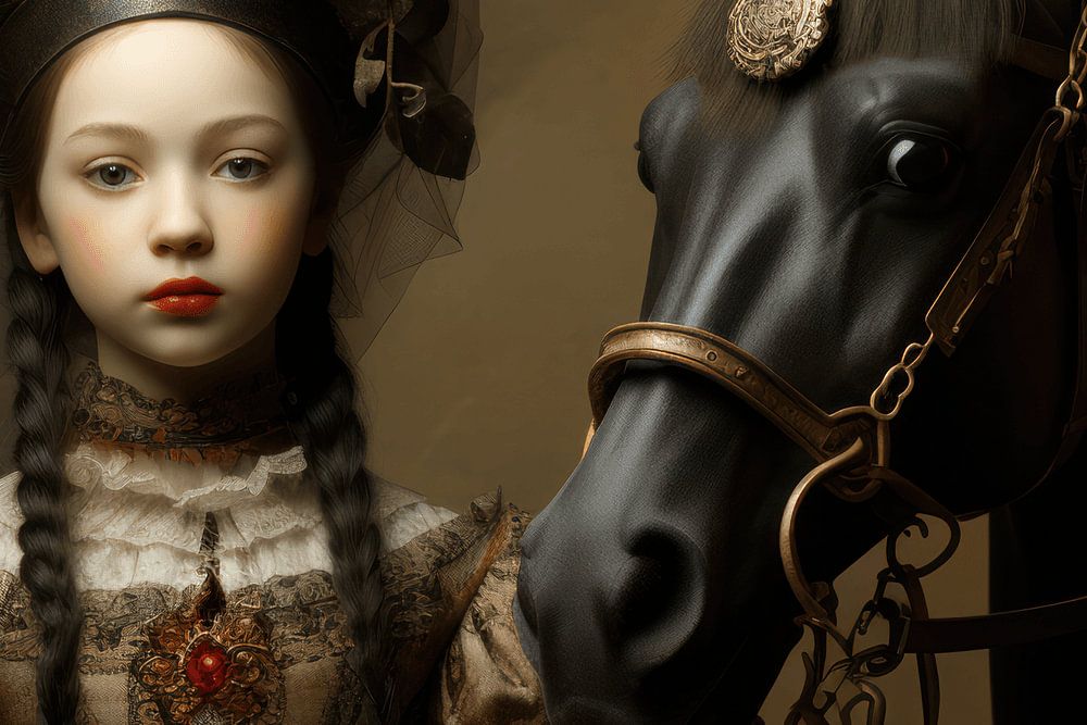 Maar het verhaal ontvouwt zich verder wanneer je oog valt op het metgezel van de pop – een majestueus paard, eveneens gecreëerd door de kunstmatige intelligentie met verbazingwekkende finesse. Het paard, een sublieme combinatie van kracht en gratie, staat naast de pop als een loyaal metgezel. De glans van zijn ogen lijkt een geheim te bewaren, alsof het de getuige is geweest van vele verhalen die door de tijd zijn geweven.