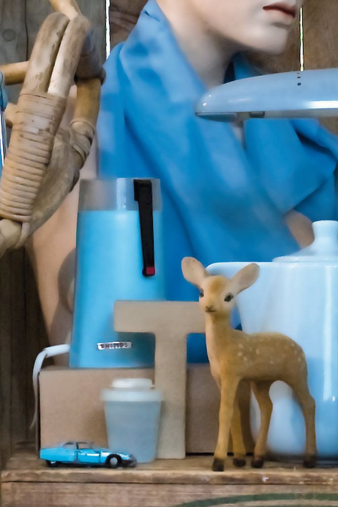 Foto van een stilleven met retro en vintage spulletjes met hout en blauw.