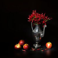 Warm , kunstzinnig stilleven met rode pepers en appels in stijl Nieuwe Meesters . Brengt een warme sfeer in uw kamer en is makkelijk inpasbaar .