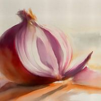 De rode ui is niet alleen erg lekker, maar ook prachtig dieprood, bijna paars van kleur. Hierdoor krijgt deze ui zo'n feestelijk tintje op dit schilderij.
