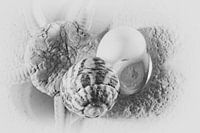De zwart-wit uitvoering en de compositie van dit stilleven met schelpen en een zeester zorgt voor rust.