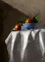 Schilderij van sinaasappels op tafel is een wat klassieker schilderij geworden dan ik normaal maak, de kleur van de sinaasappels spat echt van het doek.