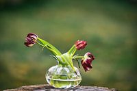 Stilleven met tulpen op glazen vaasje tegen groene achtergrond op houten tafel.