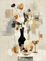 Een abstract schilderij met een zwarte vaas met bloemen, een fruitschaal en een glas op een tafel, weergegeven in een getextureerd, gedempt kleurenpalet.