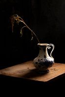 In dit stilleven staat niet de bloem, maar de tijd zelf centraal. Het licht raakt de rand van de vaas, glijdt langs het blad en laat zien hoe kwetsbaar en kostbaar vergankelijkheid kan zijn. Een ode aan stilte, licht en loslaten.