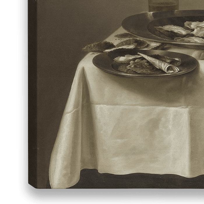 Het is ongelooflijk hoeveel schakeringen grijs Willem Heda kon schilderen. Daardoor heeft hij de voorwerpen op deze tafel ? van tin, zilver, damast, glas, parelmoer ? zo goed getroffen. Het verfijnde samenspel van kleuren wordt hier en daar aangevuld met accenten in geel en oker. Willem Heda was gespecialiseerd in bijna eenkleurige stillevens, zogeheten ?monochrome banketjes?.
