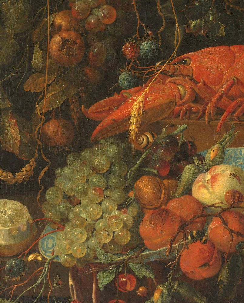 Stilleven met vruchten en een kreeft. Aan de muur hangt een festoen van vruchten. Op tafel een Chinees bord met druiven, perzik en abrikozen. Links een geschilde citroen. Tussen de vruchten allerlei insecten en slakken. Oude kopie naar het origineel in Dresden.