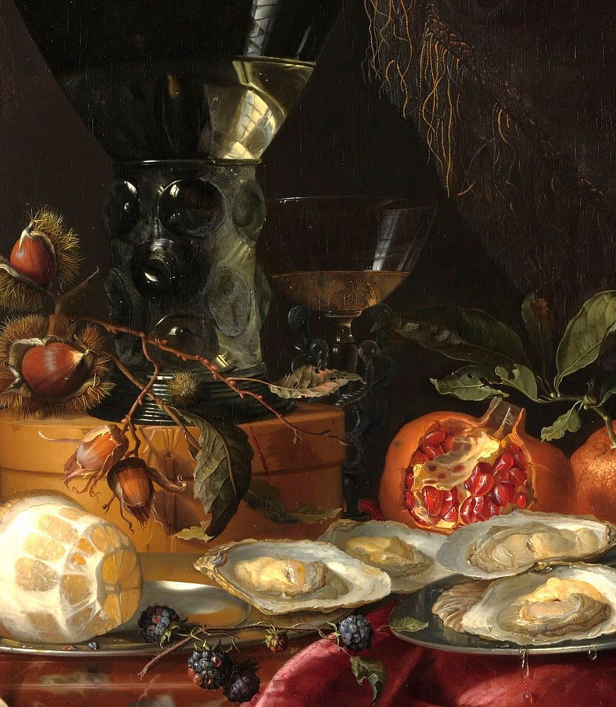 Op een marmeren plaat, gedeeltelijk bedekt met een rode doek, twee tinnen borden met oesters, een halfgeschilde citroen en bramen, daarachter nog meer fruit en een halfgevulde roemer, rechts een gordijn van paars fluweel met koord.