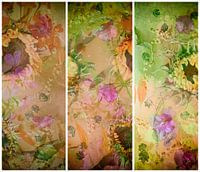 Stilleven met bougainville, mimosa, zonnebloemen en klimop. Drieluik . fleurt iedere kamer op .Ook als behang verkrijgbaar.
