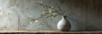 Op een oude houten tafel pronkt een eenvoudige vaas, gevuld met de pracht van de lente. Een tere tak, gebogen onder de last van bloesems, steelt de show in het intieme panorama. Zacht zonlicht speelt met schaduwen op het ruwe hout, terwijl de bloemen een dans van kleuren uitvoeren. De vaas lijkt een tijdcapsule, vasthoudend aan de vluchtige schoonheid van het seizoen. De houtnerf vertelt verhalen van voorbije jaren, terwijl de bloesems fluisteren over nieuw leven en hoop. Dit tafereel ademt eenvoudige pracht uit, een moment van stil geluk dat de natuurlijke harmonie viert, ver weg van de bruisende wereld. Het is een ode aan het alledaagse, waar schoonheid schuilt in de eenvoud van een bloeiende tak op een oude, vertrouwde tafel.