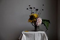 Stilleven pluk bloemen met zonnebloem op gestreepte vaas | Net terug van vakantie uit Denemarken moest ik een stilleven maken met het leuke vaasje dat ik daar vond. Handgedraaid. Hoogzomer dus genoeg moois in de tuin. Het fijne licht, maakt het plaatje compleet.