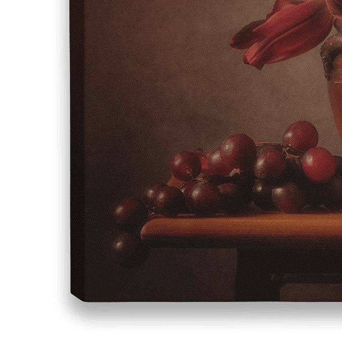 Rode tulpen, bijna verwelkt, verkleurend naar robijnrood in combinatie met robijnrode druiven.