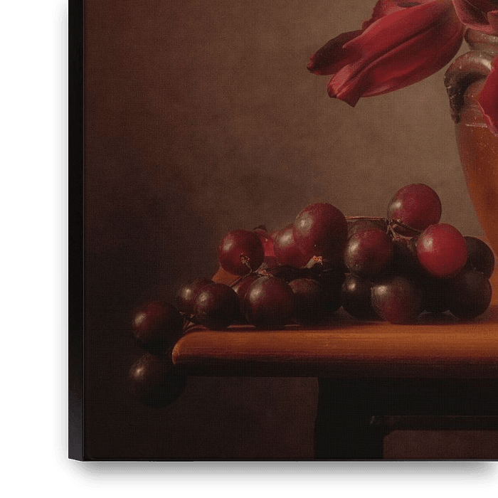 Rode tulpen, bijna verwelkt, verkleurend naar robijnrood in combinatie met robijnrode druiven.