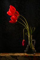 Rode tulpen in een glazen vaasje, de kracht van de compositie zit vooral in de ene tulp die de kop laat hangen. Een fraai stilleven door haar eenvoud.