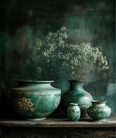 Prachtig stilleven van antieke vazen in smaragd groen. Dit werk heeft een hele serene uitstraling en brengt rust en sfeer in het interieur. Past ook heel mooi in een meubelzaak of in een restaurant.