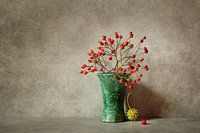 Een modern of klassiek, stilleven van een groen vaasje met daarin een takje met rode bessen. De compositie wordt aangevuld door een groene stekelbal van de Amberboom en een extra rood besje op de voorgrond.