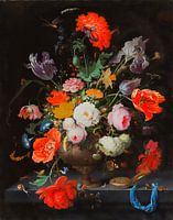 De kleuren zijn verwerk in moderne kunst.Stilleven met bloemen en een horloge. Op een stenen plint ligt een gouden horloge met blauw lint naast een boeket bloemen (tulpen, rozen, papavers, anemonen, narcissen en irissen) in een vaas. Tussen de bloemen en op de plint bevinden zich slakken, rupsen, een hommel en een libel.