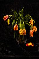 Stilleven van Franse oranje/rood gele tulpen in een glazen vaas met een bloemkop naast de vaas. Uitgevoerd in kleur, tegen een zwarte achtergrond waarvan iets van de structuur te zien is.