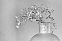 Deze foto toont de schoonheid van verval. De Hortensia bloesem gedroogd en verweerd door de zon in een zwart/wit uitvoering. De foto geeft vooral rust aan de muur.