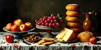 Rechts staat een grote wig bleekgele kaas met een kruimelige textuur op een decoratief bord. Naast de kaas ligt een rond brood met een knapperige korst en een stapel met suiker bestrooide broodjes, wat een gevoel van overvloed oproept. Een gepolijste bruine keramische kan staat sierlijk erbij, met een gebogen handvat dat verfijning toevoegt. De donkere achtergrond versterkt het kleurrijke tafereel en roept de sfeer op van een klassiek stilleven.