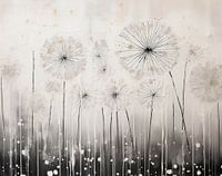 Paardenbloemen op een mistige achtergrond, waarbij de bloemen variëren in focus en grootte, wat een gevoel van diepte creëert. De paardenbloemen zijn gestileerd met fijne, spinnenwebachtige lijnen die de fragiele structuur van de zaadpluisjes vastleggen. De achtergrond is een wash van beige en witte tinten, met vlekken die suggereren dat de tijd zijn sporen heeft achtergelaten. De onderkant van de compositie is donkerder, waardoor het lijkt alsof de bloemen oprijzen uit de duisternis. Dit gebruik van licht en schaduw versterkt het etherische en dromerige karakter van het werk. Kleine, witte accenten die lijken op zwevende zaadjes, voegen een element van beweging en leven toe. Het algehele kleurenpalet is zacht en neutraal, wat zorgt voor een kalme en serene uitstraling.