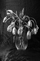 Franse tulpen in een glazen vaas. Uitgevoerd in zwartwit tegen een zwarte achtergrond waarvan iets van de structuur te zien is.