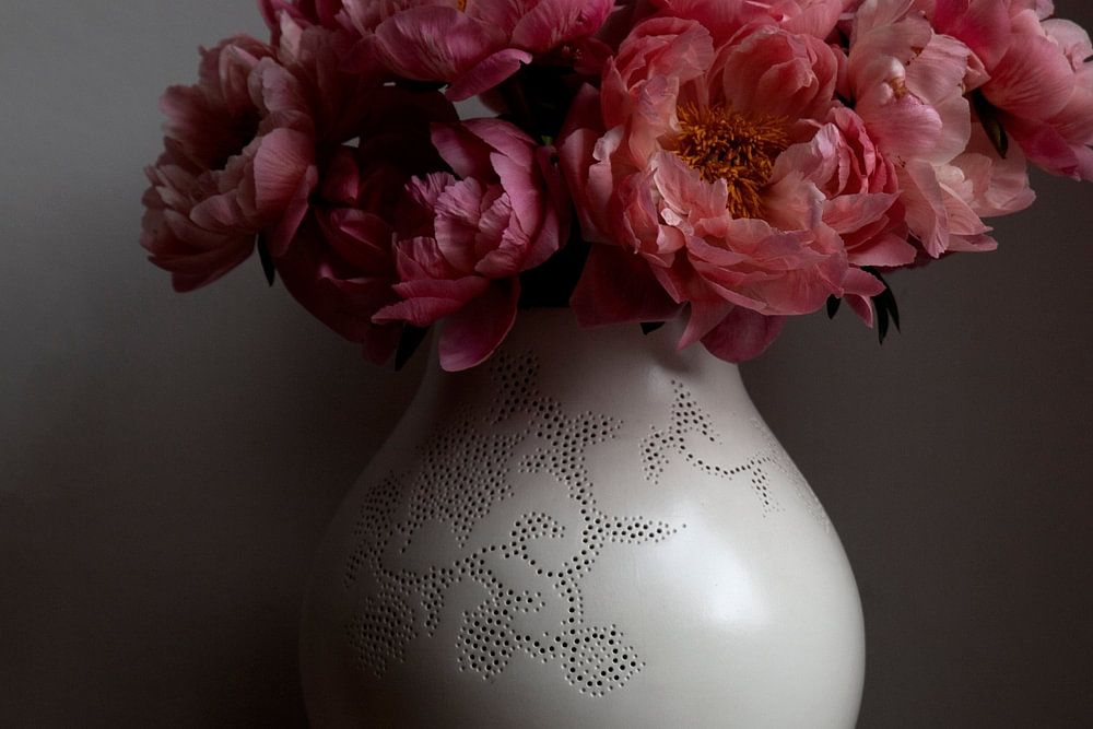 Stilleven van bloeiende pioenen | Pioenen! Nog zo'n favoriete bloem van me. Deze toverpioenen lonkten gewoon om gefotografeerd te worden. De overdaad, het lijken net wuivende rokken. Heerlijk. De PS vaas van Ikea door Hella Jongerius blijft een plaatje na al die jaren. De vaas is niet meer verkrijgbaar bij Ikea, wel op marktplaats.