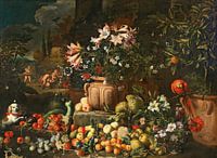 Stilleven van bloemen met vruchten, putti en dieren, Abraham Brueghel