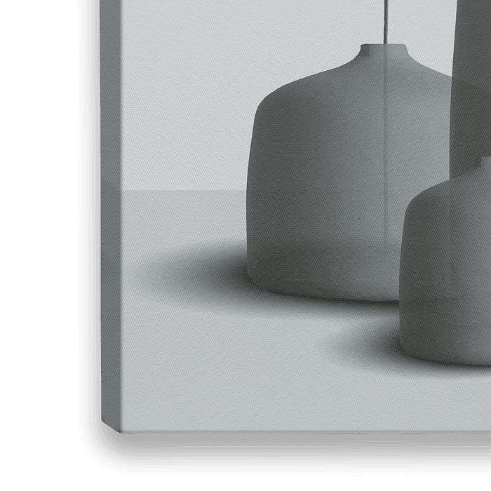 Koop dit abstracte kunstwerk Stilleven van ceramiek, vazen en potten met tak, stijlvolle compositie in grijs-blauw van Color Square op canvas, aluminium dibond, (ingelijste) fotoprint, behang en ArtFrame, op maat geprint in Fine-Art kwaliteit.