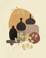 Minimalistisch-abstract stilleven van drie vazen, twee takjes van een eucalyptusboom en een aantal organische vormen. De lichte en donkere aardetinten zorgen voor mooie, subtiele contrasten.