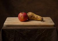 Stilleven van oud fruit, een apple en een peer. Een zachte verlichting, met slechts 1 lichtbron, maakt dat de structuren van het materiaal goed uitkomen.
