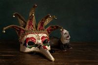 Stilleven van een fret pup met een Venetiaans of Carnavals masker tegen een groene achtergrond