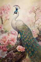Stilleven van een pauw met roze bloemen van Digitale Schilderijen