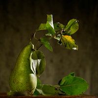 Stilleven peer met bladeren. Met mooi zijlicht en tegenlicht wat door de bladeren valt. Geinspireerd op klassieke stillevens maar dan met nieuwe touch. Mooi qua vorm en structuur. Picturalistische stijl.