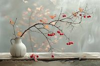 Stilleven van een tak met besjes in Japandi stijl. In een Japandi interieur wordt Scandinavisch design en Japans minimalisme gecombineerd. Eenvoud en strakke lijnen zijn typerend voor het Scandinavische interieur, maar de soberheid en de neutrale kleuren zijn juist zeer Japans. Kleuren die kenmerkend zijn voor de Japandi stijl zijn dan ook lichte, warme kleuren.