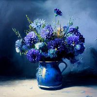 Een prachtig stilleven van een boeket met blauwpaarse en lavendelkleurige bloemen tegen een donkerblauwe achtergrond.