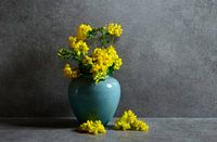 Door veel regen waren er takken van dit gele stuikje afgebroken. Ik kon niet anders dan ze in het water zetten en van wat kleine takjes stillevens maken. De kleurcombinatie geel, blauw en groen vond ik mooi tegen een neutraal grijze achtergrond.