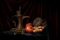 Een stilleven van een arabische theekan, een potje, granaatappel en groene asperges.