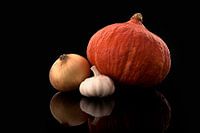 Stilleven van pompoen, ui en knoflook op een zwarte achtergrond