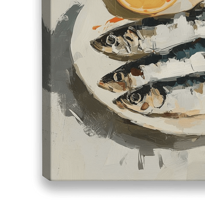 Dit eigentijdse stilleven toont drie verse sardines op een crèmekleurig keramisch bord, geflankeerd door een halve citroen en een sappige part. Naast het bord staat een glas rosé-achtige drank waarin de warme tinten schemeren. De achtergrond is een rustgevend grijsgroene muur, terwijl de tafel in lichte beigetinten is opgezet; overal…
