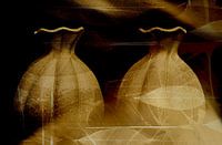 Donker sober stilleven van twee prachtig gevormde bolle vazen van ruw aardewerk in bruin en goud tinten in een verouderde look. Afgewerkt met een doorzichtige textuur van bladeren. Fotografie in combinatie met digital art. Komt prachtig tot zijn recht in een klassieke of moderne omgeving. Geen A.I.