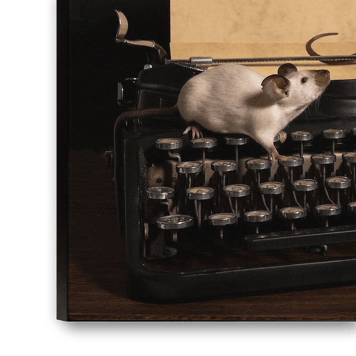 Stilleven van zes siamese muizen op een typmachine en telefoon die de scene verkennen in een schilderachtige verlichting