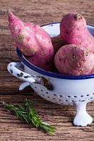 Een staande foto van zoete paarse aardappelen in een oude vergiet op een houten tafel. Ter decoratie zijn 2 takjes rozemarijn toegevoegd.