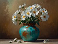 Stilleven van witte bloemen in een aardewerken turquoise vaas tegen een bruine achtergrond. Een romantisch kunstwerk geschikt voor elke ruimte.