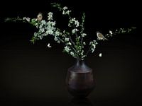 Foto van een tak met witte bloesem in een bruine vaas. Digitaal bewerkt met huismusjes en vlinders en zwart/ donker bruine achtergrond